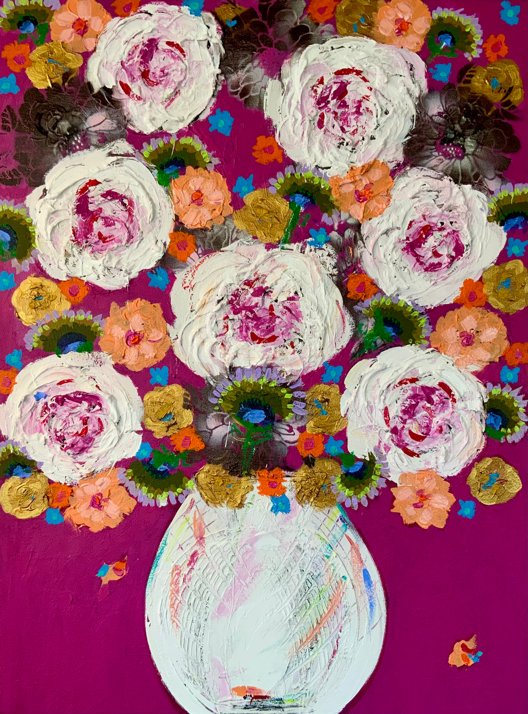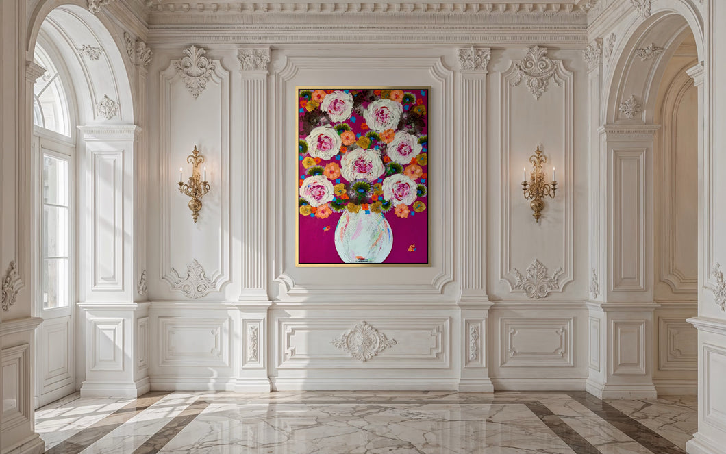 Painted with heavy-body acrylics on stretched canvas, this piece carries a luxurious tactile presence—each petal and gesture catching light and shadow in a way that brings the bouquet to life. Elegant yet exuberant, it bridges contemporary vibrancy with timeless floral romance.