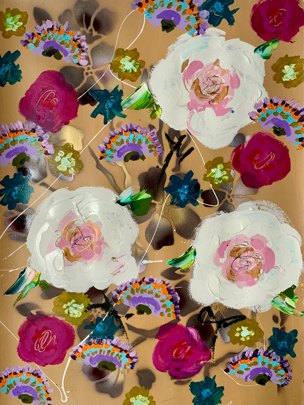 Rich, modern florals meet expressive texture in these original works on paper by artist Joni Sarah White. Created with heavy-body acrylic on 22” x 30” Arches archival paper, the pieces feature layered white camellia-style blooms, deep magenta roses, and painterly botanical motifs over a warm neutral ground — a palette that works beautifully in contemporary, transitional, and eclectic interiors.