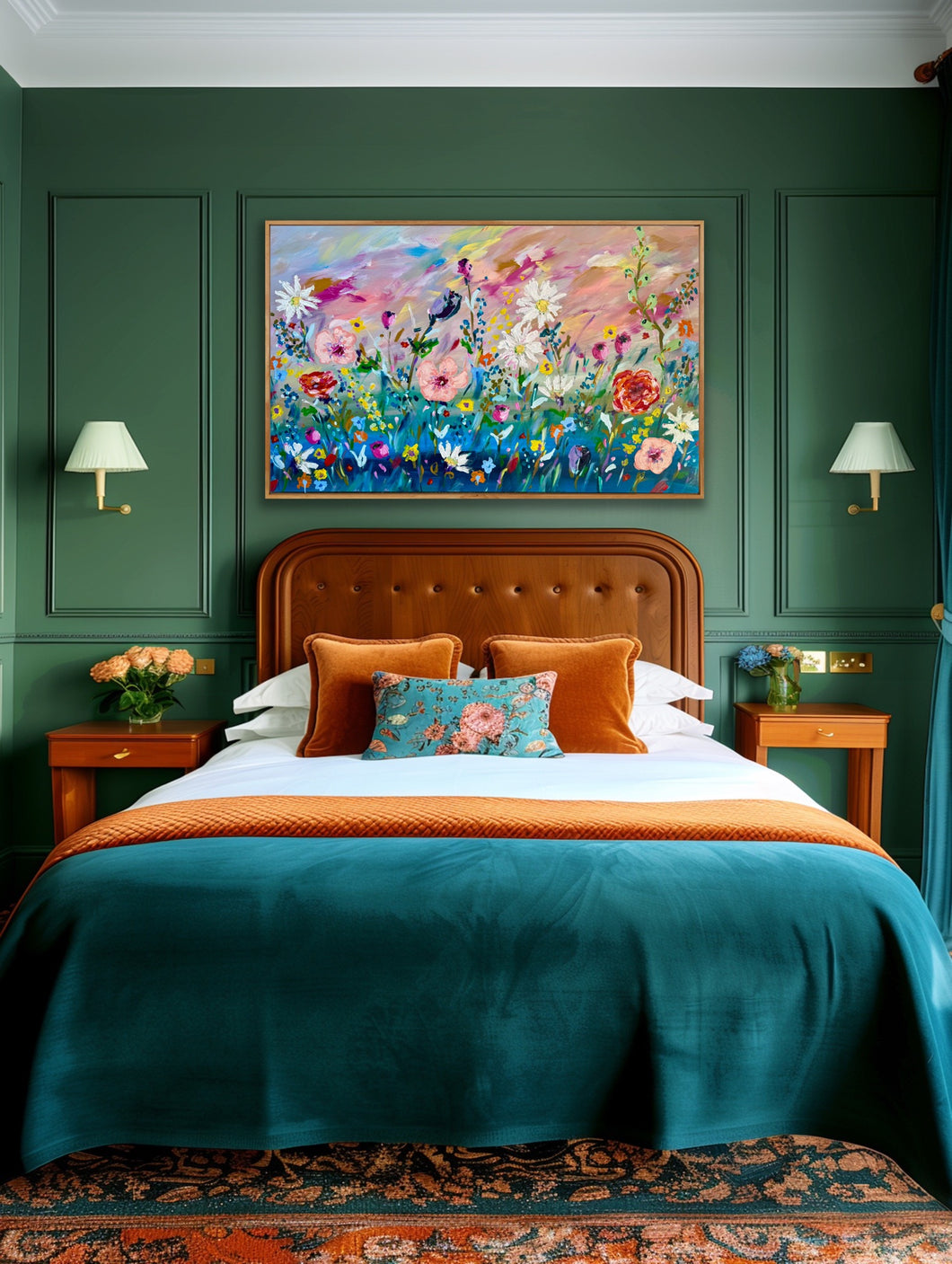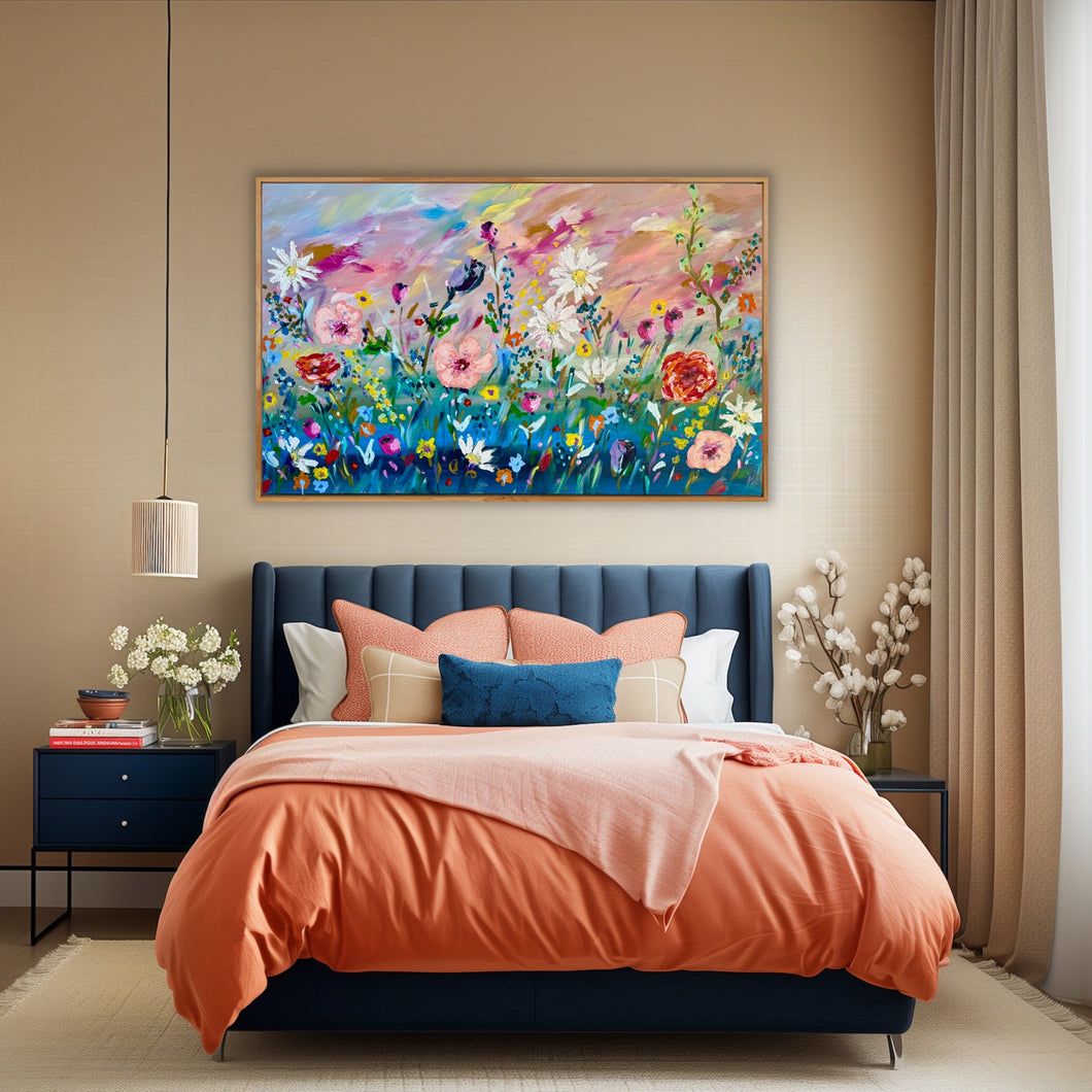 A colorful field of flowers stretches across this joyful landscape, filled with movement and life. Blush pinks, sunny yellows, and sky blues dance together under a soft pastel sky, bringing the spirit of spring into your home year-round.